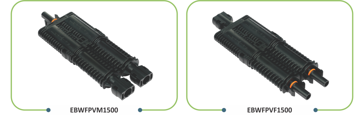 elmex PV Solar Branch Inline fuse connectors EBWFPVM1500 and EBWFPVF1500 are applicable for parallel connection for Photovoltaic string protection depending on on-site application. Branch inline fuse connectors have 3 branches, 2 for inputs either male or female and 1 for output either male or female. These connectors have plug and socket design and are constructed using flame retardant engineering thermoplastic suitable for exposure to UV rays & for application in PV power generation system. elmex PV branch inline fuse connectors are suitable for use with gPV (Cylindrical) fuse of ø 10 X 85 mm.